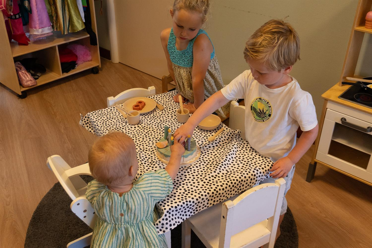 Als het voorjaar aanbreekt, wordt de moestuin van 't Bloemenhuisje opnieuw gevuld. De oudere kinderen nemen hun taak erg serieus en verzorgen de plantjes goed, terwijl de jongere kinderen rustig spelen in de buitenbox of op een kleedje in het gras.